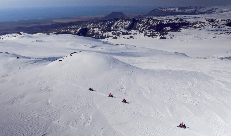S těmito sněžnými skútry se dostanete na ledovec Mýrdalsjökull, což je čtvrtý největší ledovec Islandu. Pokrývá plochu 520 km² a má mnoho nádherných ledovcových splazů jako je právě námi navštěvovaný Sólheimajökull. Zde poznáte úchvatné království ledu a při dobré viditelnosti se vám naskytnou úžasné výhledy na jižní pobřeží Islandu.