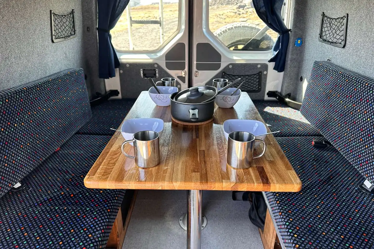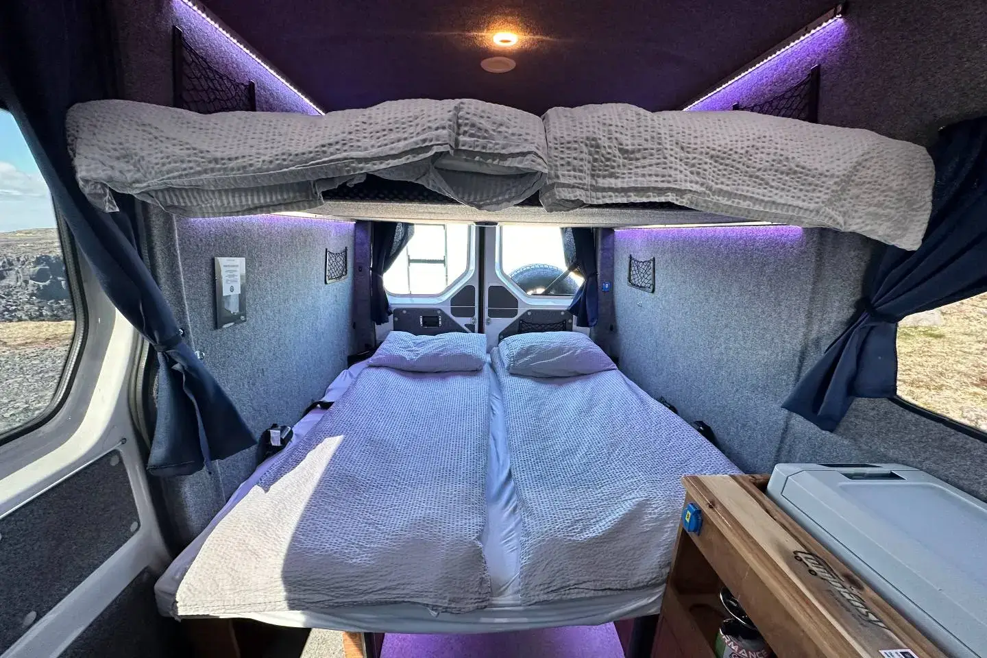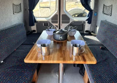 Interiér je postaven na pevné, profesionální vestavbě optimalizované pro pět cestujících a nabízí promyšlené uspořádání prostoru, pohodlná lůžka, kvalitní izolaci a plně vybavenou kuchyňku. Díky spojení spolehlivé platformy Volkswagen a profesionální vestavby vzniká camper, který poskytuje vysoký komfort, praktičnost i spolehlivost při objevování Islandu bez kompromisů.